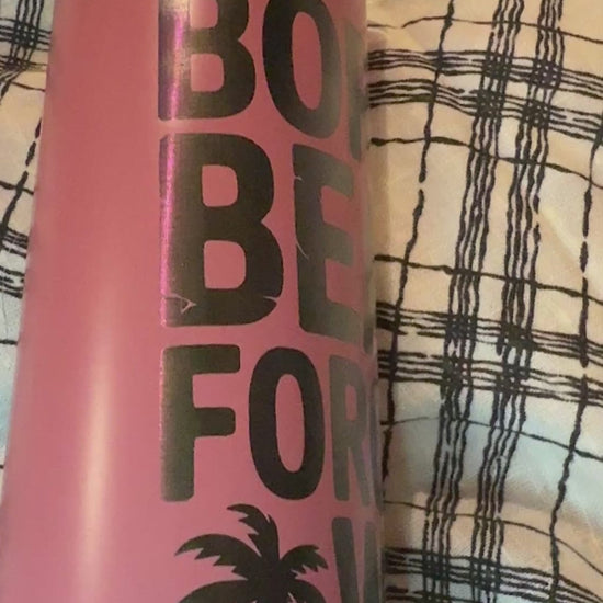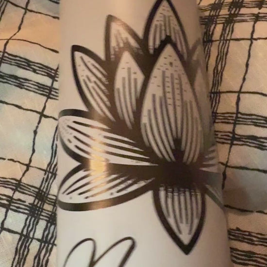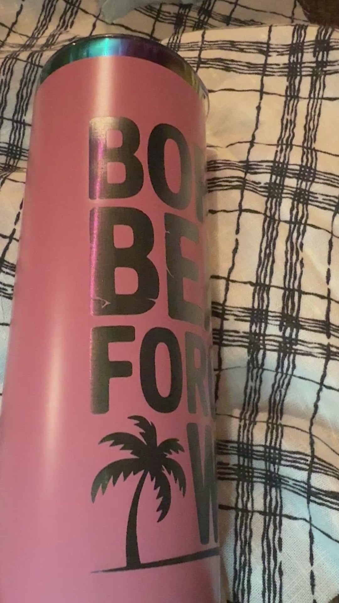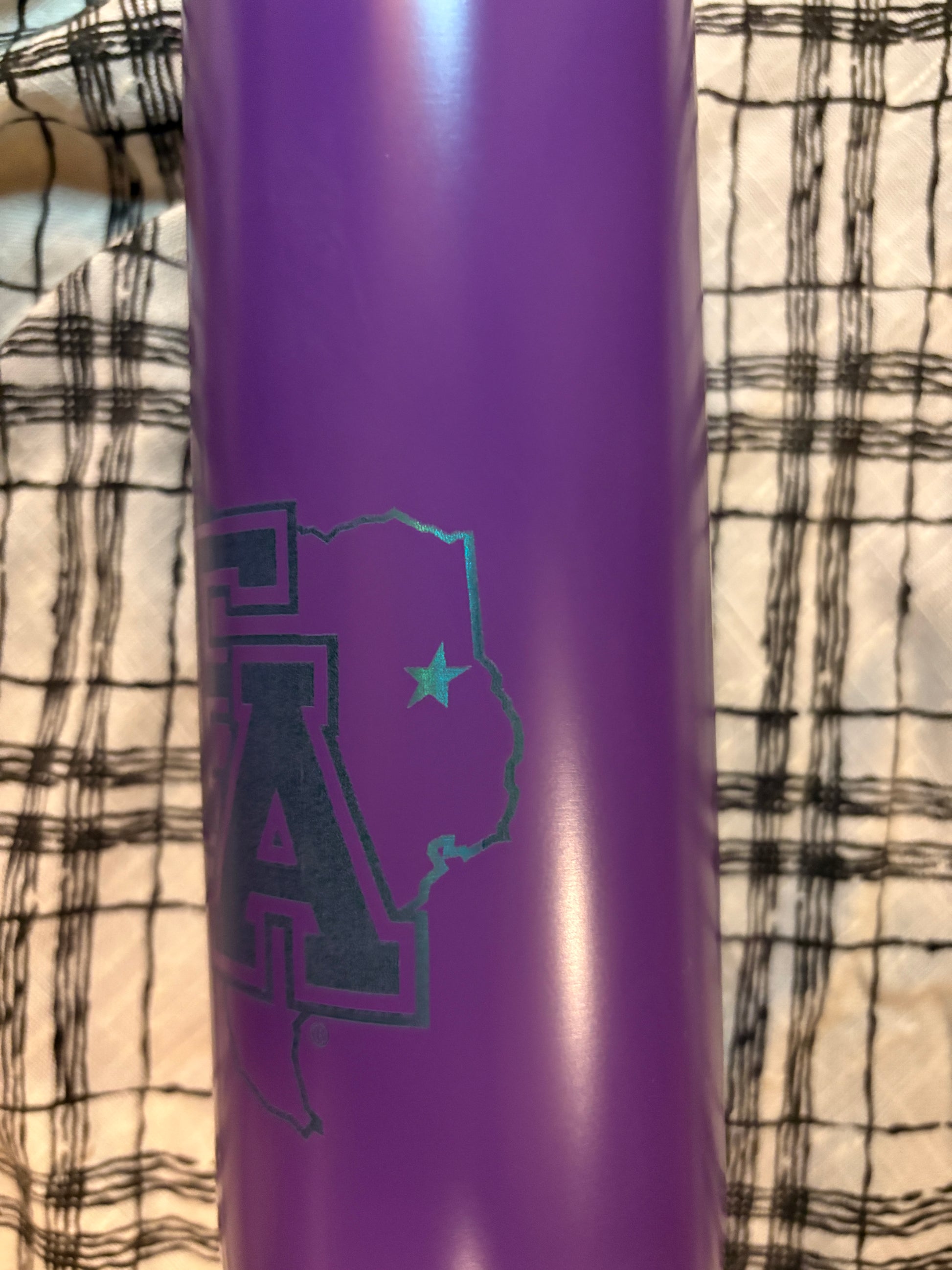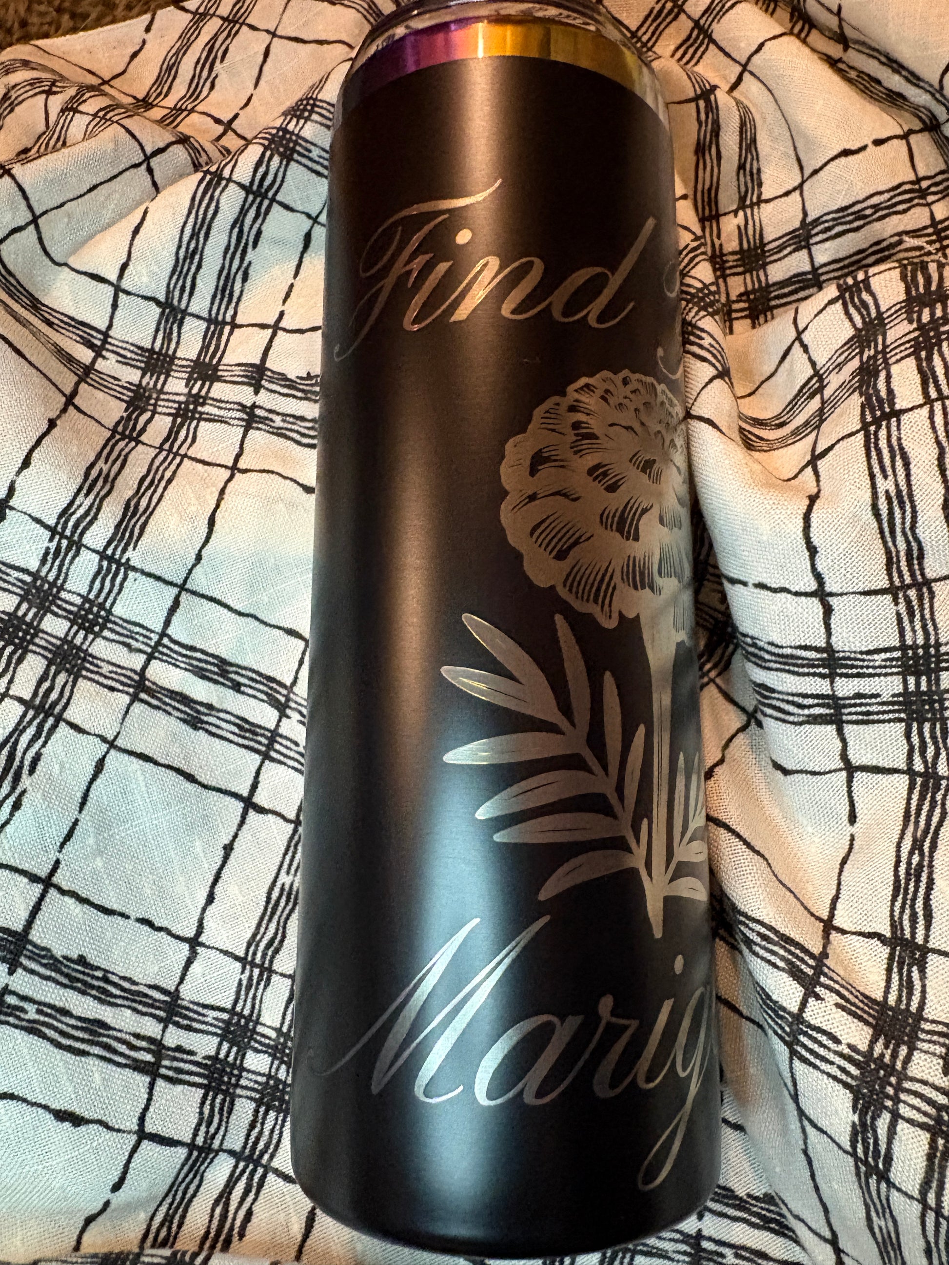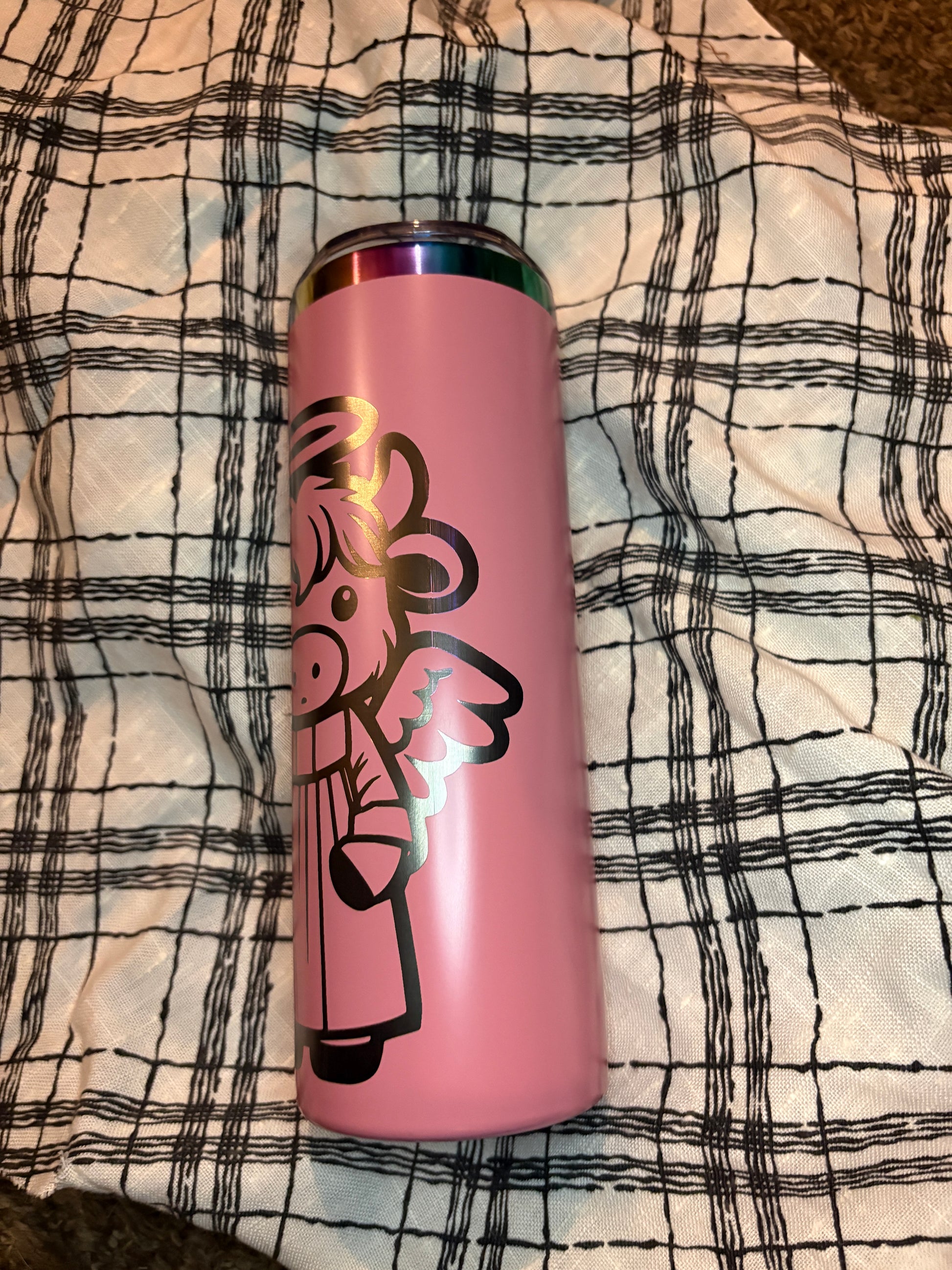 You can choose a 20 oz. powder coated stainless steel tumbler or 20 oz. skinny straight powder coated tumbler with rainbow colored stainless steel. Both tumblers are equipped with a plastic lid. Skinny Tumblers also include a plastic straw.